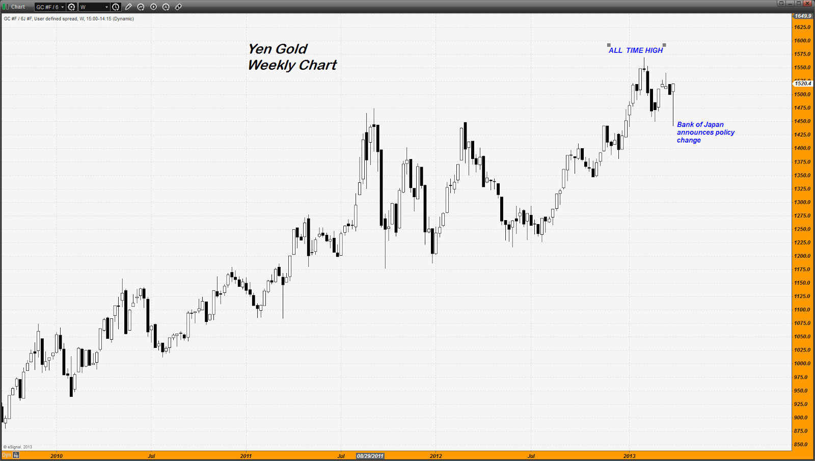 It looks as if the bullish euphoria, a euphoria which I have been mocking and will continue to do so, is finally wearing off of the equity bulls. WE noted this week on the S&P 500 chart a "just miss" on a Bearish downside reversal pattern. After we got news about the Bank of Japan's "all-in" on the liquidity front, the force of the reversal was lessened as risk was back in vogue. Today, that reversal pattern is seeing some further downside confirmation. The day is yet young but the S&P 500 stands a good chance of putting in a WEEKLY DOWNSIDE REVERSAL PATTERN. We have not seen one of these on the S&P 500 chart for a long time (since May 2011). If the market does not stage one of those late-in-the-session miraculous recoveries, it could very well portend that this overbought, overextended stock market is going to finally see a deeper and more protracted retracement in price.