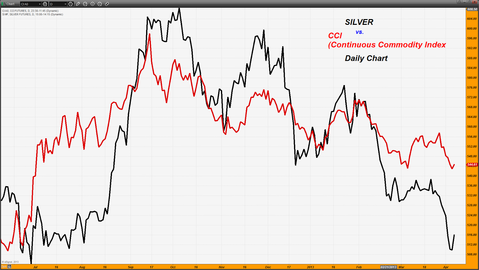 Take a look at the following chart I put together to help you understand this. Note that there are two lines; one in red which is the Continuous Commodity Index or CCI; the other in Black, which is Silver. Can you not clearly seen that these two lines exhibit a near perfect symmetry? I have pointed this out in the past but feel the need to do so again. What is this chart saying?