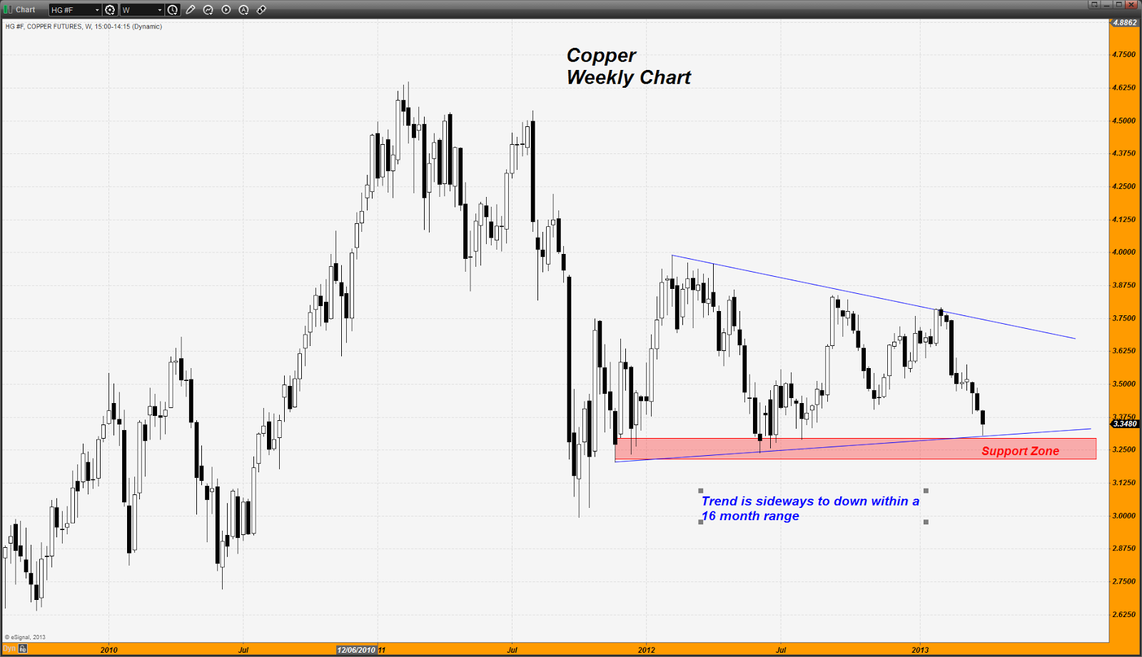 I will leave you with a chart of copper indicating the trend which currently is sideways to down. It is closing in on a support zone. If it were to break down through this zone for any reason, it would signal odds of a further slowdown in global economic growth. Given the size of the recent Bank of Japan "anti-deflation" package, along with the rest of the actions by the Western Central Banks, and the actions of the Chinese, it seems to me that the odds of this market breaking that level are not especially high however. If it bounces off of support, I would look for silver to hold support also. If not, silver is going lower.”- Dan Norcini, More at http://www.traderdannorcini.blogspot.com/