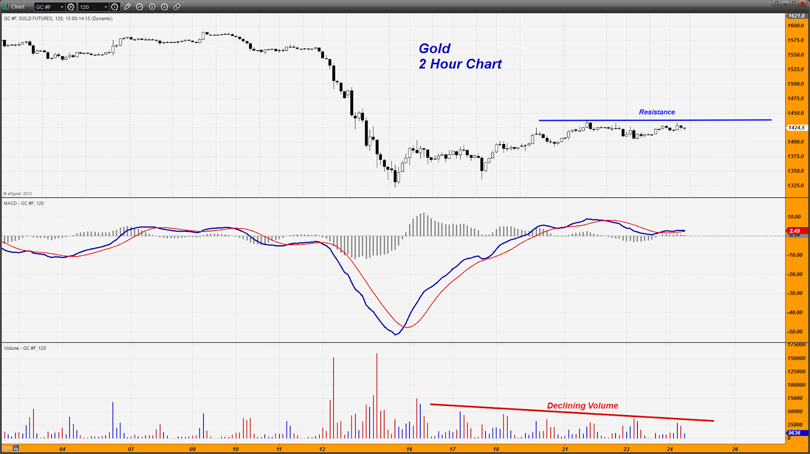 Right now, the top of the range is near $1440. Selling is entering near this level and bullish enthusiasm is fading as the market moves higher based on the shrinking volume. With volume low, bears feel confident selling against this level since they have some wiggle room to play with the $1450 psychological level as a mental stop out point. That is a relatively favorable trade in their minds since the risk is small compared to the potential for a drift back towards $1400 and perhaps lower.