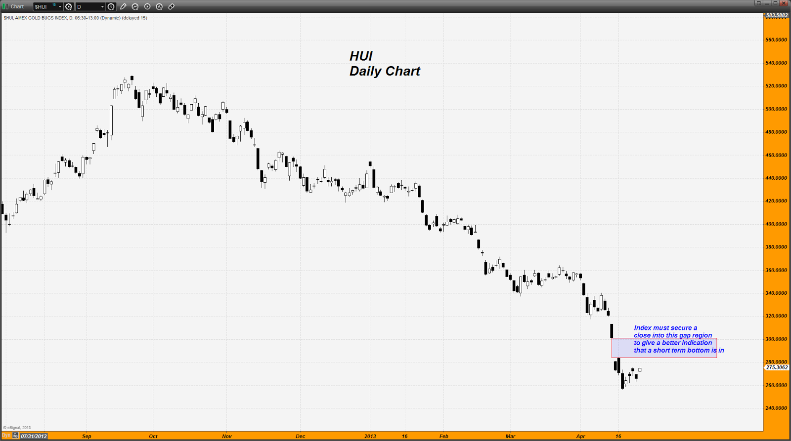 For that to occur, buyers will have to show enough conviction to take the index into the gap region shown on the price chart. They will not only need to spike it into that gap, but hold it there on a close for a bare minimum. If they can do that, it should give some bears second thoughts about hanging around excessively long and overstaying some successful trades in the mining sector.