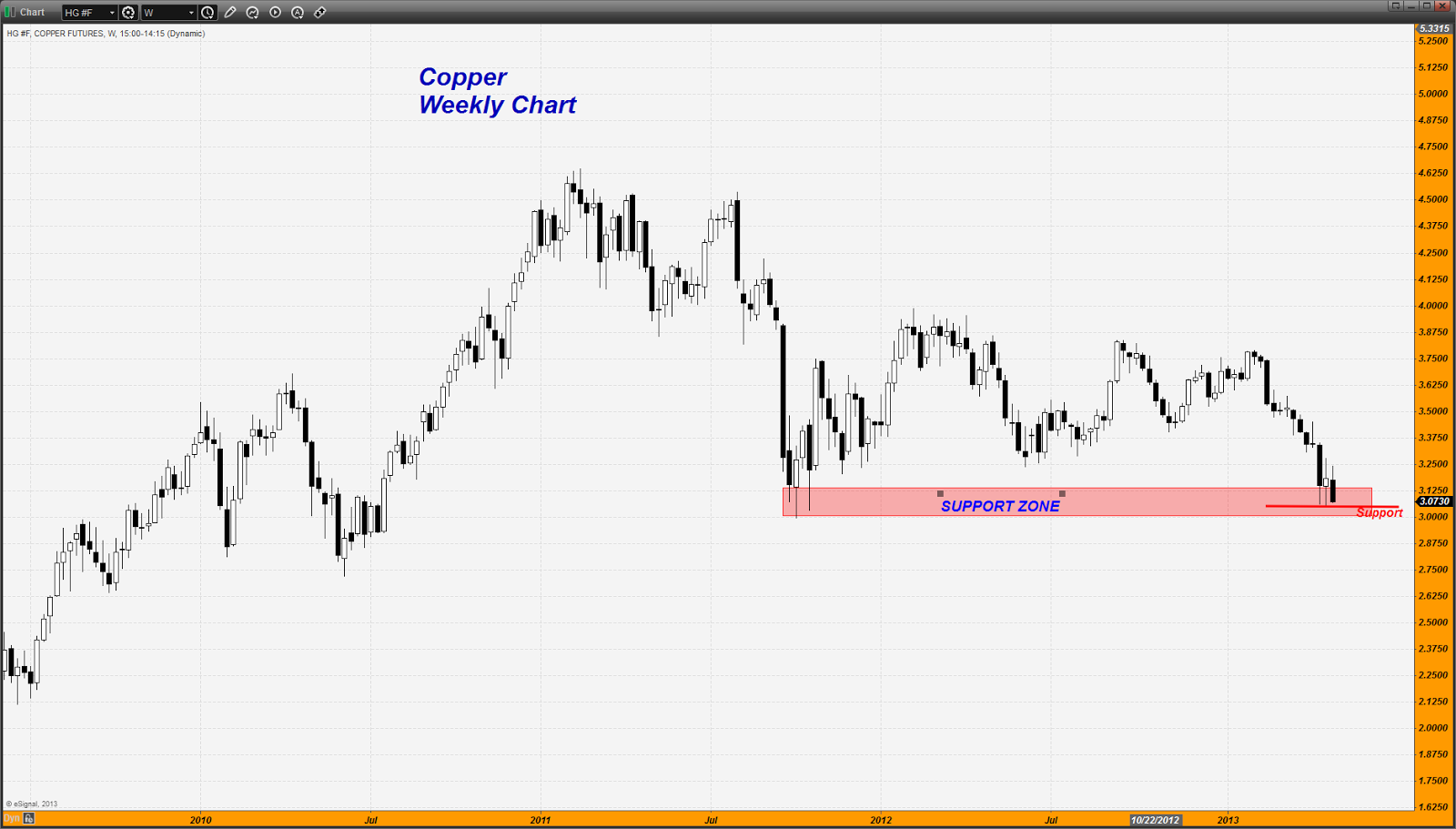 I want to stress how important this support zone is that I have noted on the chart. If copper fails here to end the week, it is going to portend a definite slowdown in the global economy and one which I am of the opinion of, that not even the stock markets are going to be able to ignore any longer.