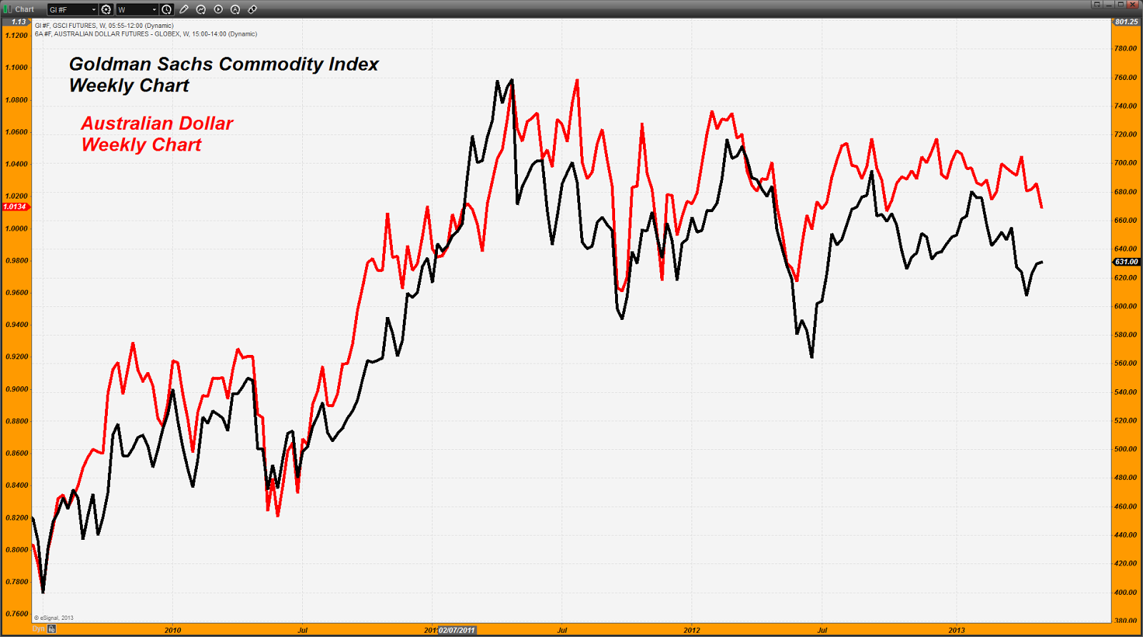 It is a combined chart of both the Goldman Sachs Commodity Index or GSCI and the Australian Dollar. (Just a reminder here that they have effectively killed my old reliable friend, the Continuous Commodity Index or CCI and thus the reason for the switch to the GSCI).