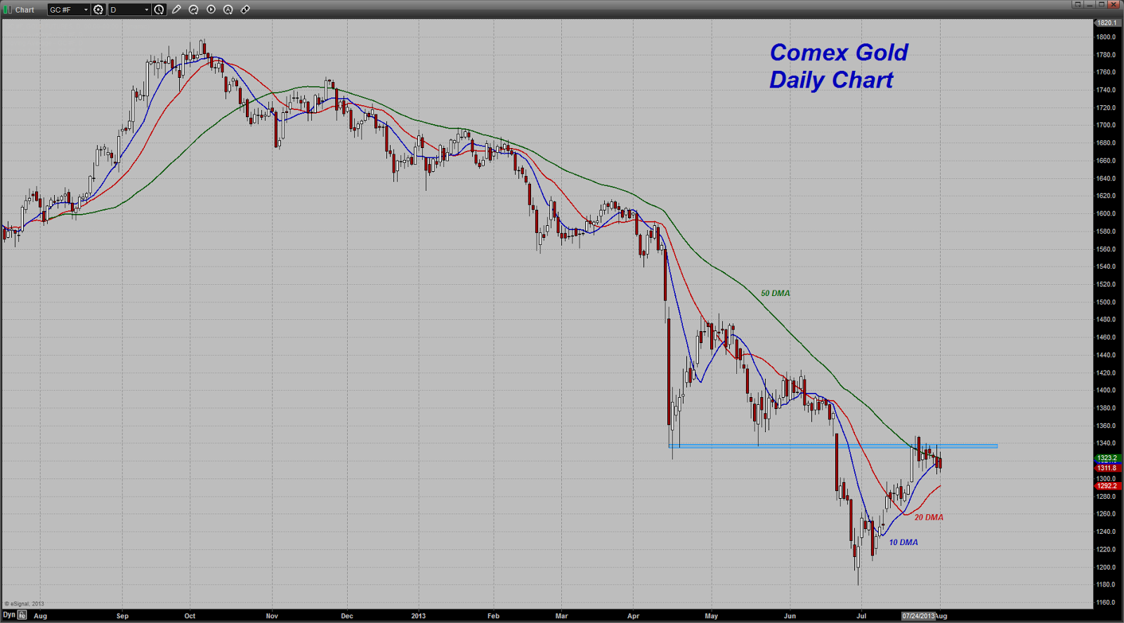 Let me comment here also a bit further on the backwardation thing - I mentioned that I would keep us posted if the delivery month contract, August, were to move to a premium over the next month contract, which for all practical purposes is the October. Currently, as of this hour, the BIDS for August are running about $0.40 premium to the bids for October and are actually on a par with the December. They are also a mere $1.00 discount to the February 2014 gold contract. NOW, we have the beginnings of a true backwardation structure on the futures board that we have not previously had. It is not completely there yet but for today, it certainly is moving that way.