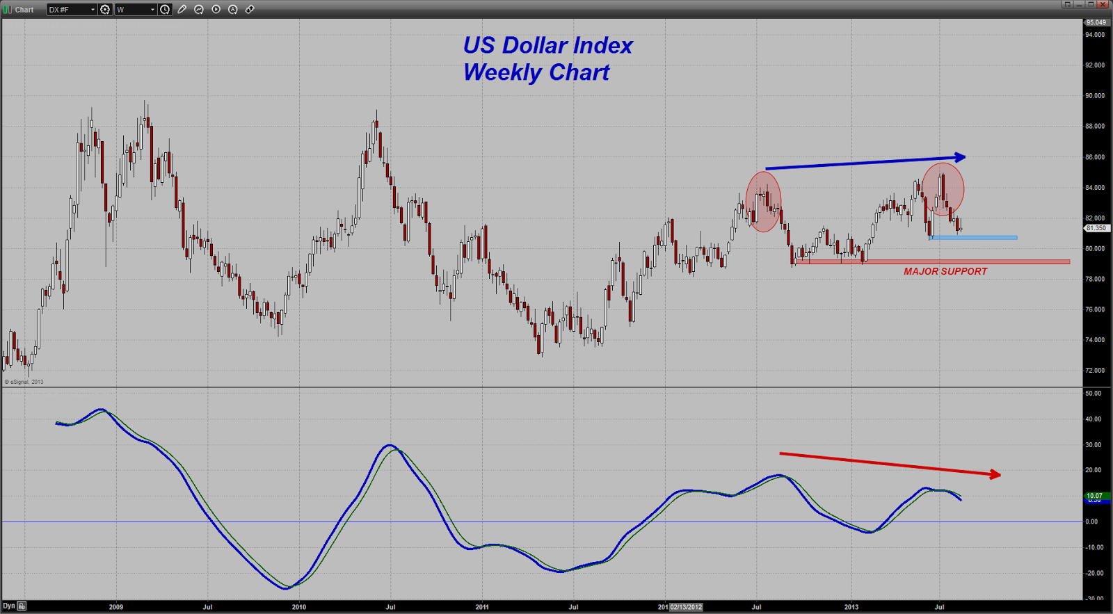 I would have to see a weekly close BELOW the band of "MAJOR" support noted on the chart to turn bearish the Dollar. Right now I am ambivalent towards it, being neither bullish or bearish except for the shortest of term trades.”- Dan Norcini, More at http://www.traderdannorcini.blogspot.com/