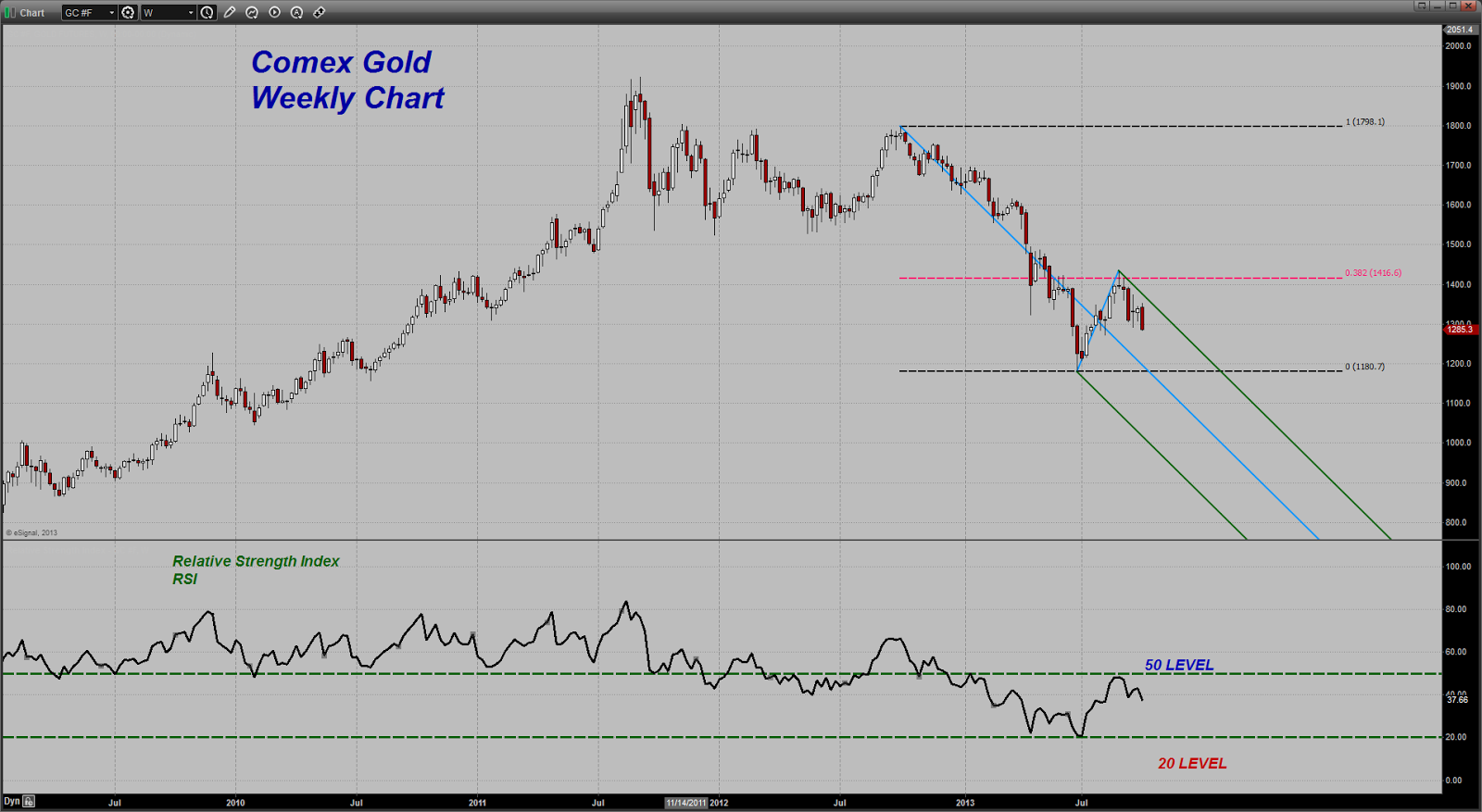 I have also included a longer term weekly chart of gold to illustrate the problem with this market from a technical analysis standpoint. Start at the beginning of 2013 and look at the bottom indicator, the old, very reliable and familiar RSI, or Relative Strength Index. For the entirety of this year, this index has not moved above the 50 level for this weekly time frame. As a matter of fact it has oscillated between 50 on the top and 20 on the bottom. By definition, this is a market that is in a BEARISH posture. If gold were able to at least push high enough to take the RSI above 65, I would feel more comfortable about its prospects for the immediate future. It cannot even accomplish that in spite of the recent FOMC press release stating that there would be no letup in the bond buying program. What is it going to take to get this metal to have anything to the upside if it cannot push higher and remain higher on that sort of news?