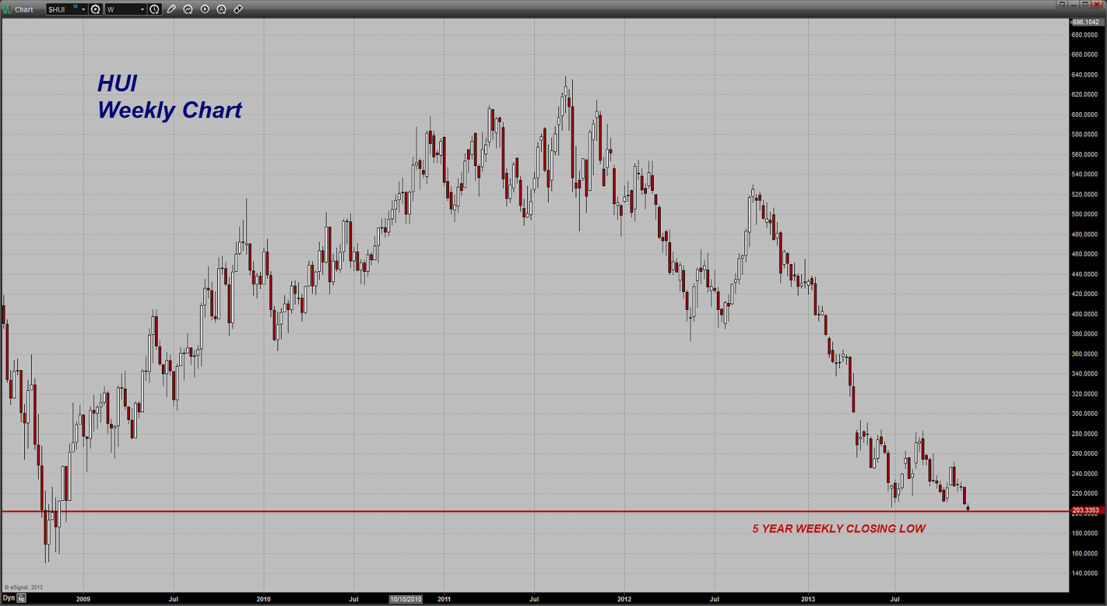 The index is currently sitting near its session low of 203.04. As things stand at this moment, it is on track for the WORST WEEKLY CLOSE since November 2008. That is FIVE YEARS. As painful as it is for me to say this, another way of stating this is that the index has surrendered every single bit of its gains it made over the last 5 years. We are now talking about the potential for the index, IF IT BREACHES 200, to move to levels last seen at the very inception of the first QE program. Five years of wasted opportunity cost.