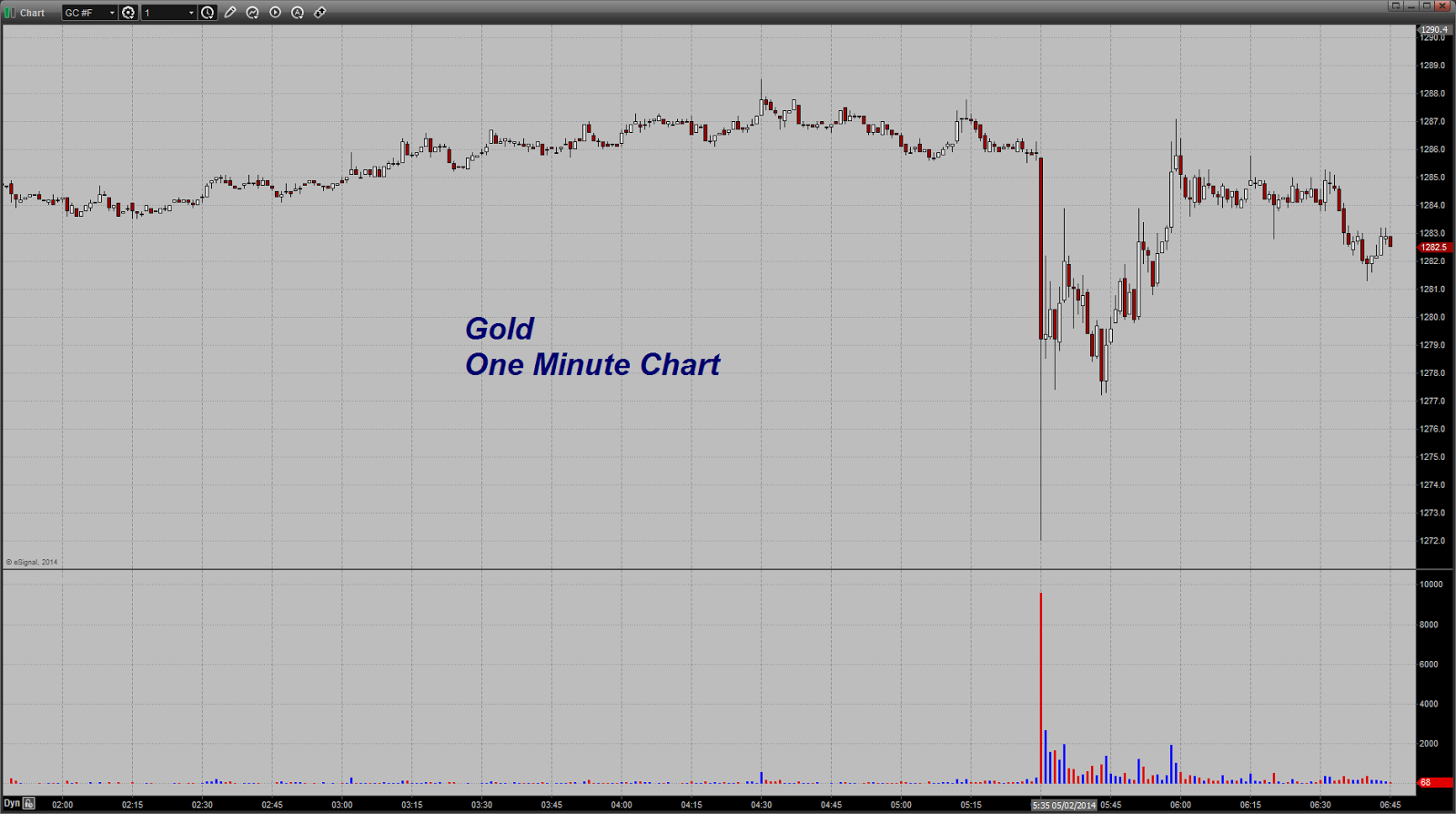 Here is that one minute bar chart I promised you on the gold market and its goofy ride this morning.