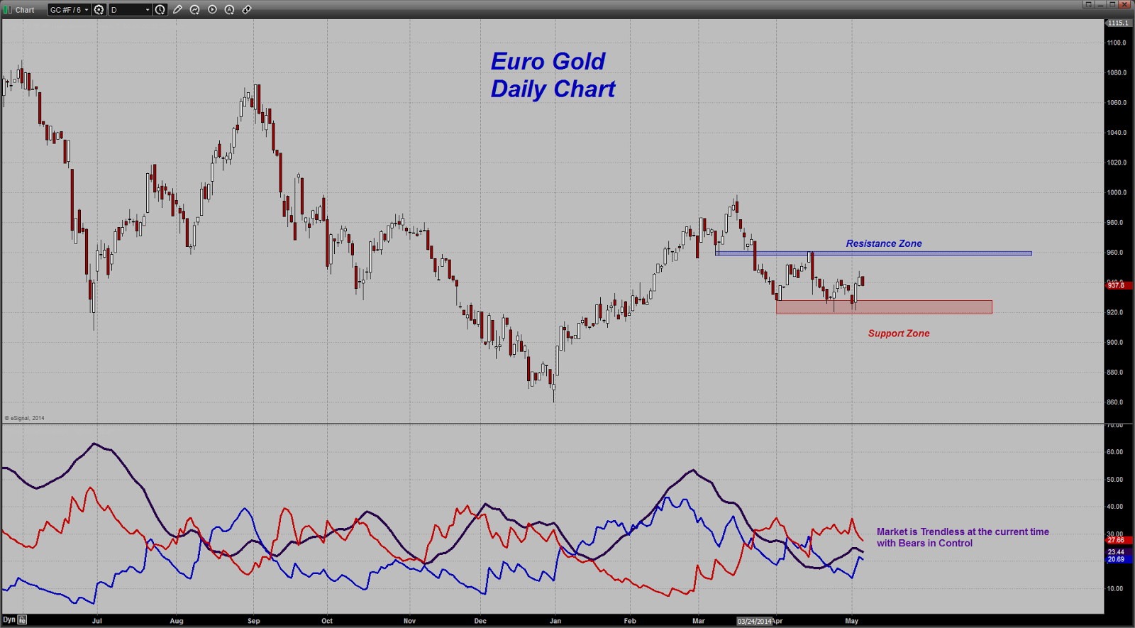 Euro gold is stuck in a range trade just like its Dollar-priced counterpart. The ADX shows a trendless market but one in which bearish forces are currently dominating. You can see both the resistance zone and the support zone I have noted. For the potential to trend to occur, one of these zones will need to be convincingly taken out.