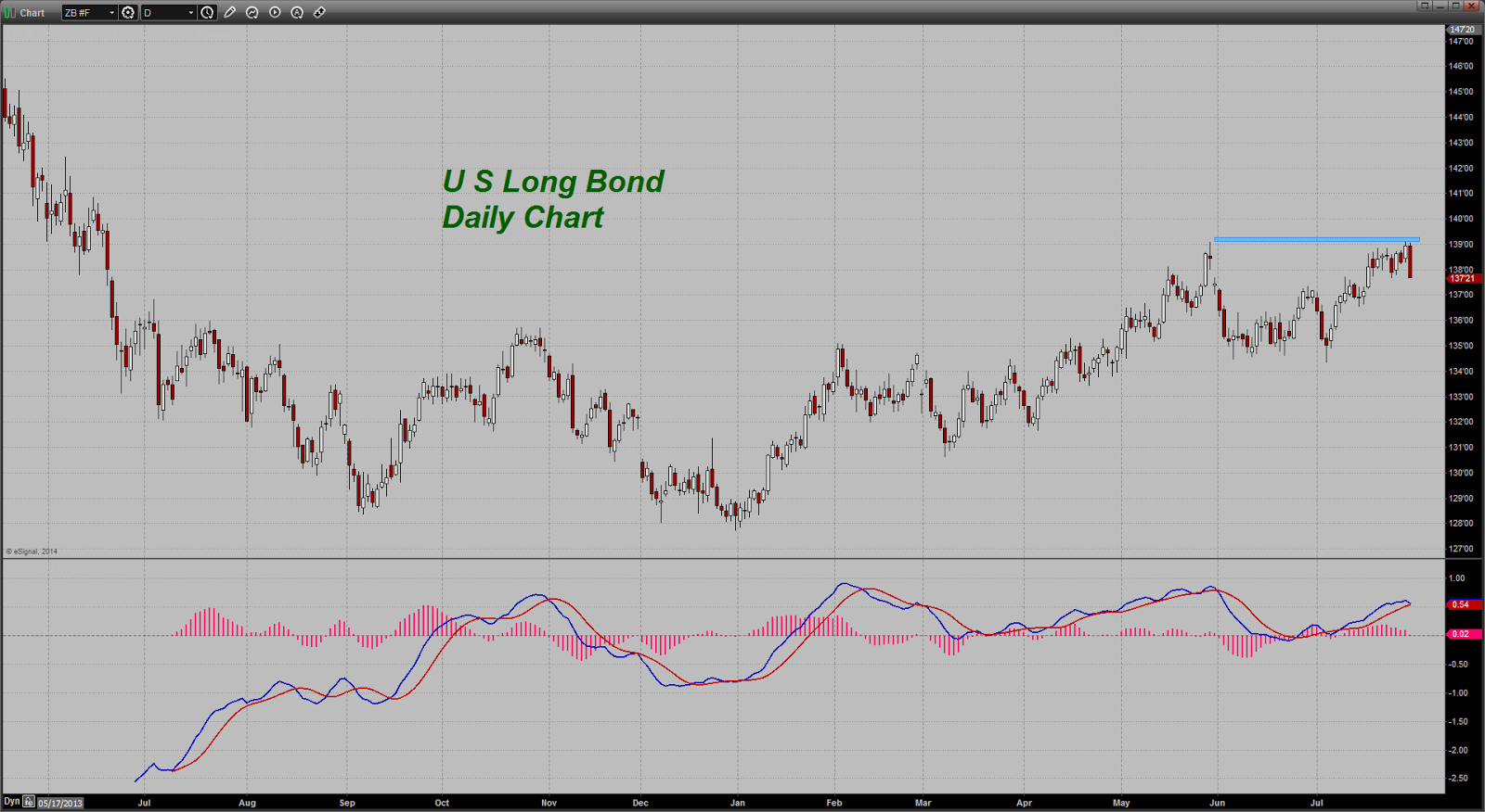 Here is the chart of the long bond. It seems to have reached its zenith near the 139 level. Today's GDP number was simply too much for the market to extend any higher. We have a ceiling now at this level for the time being meaning it will take some sort of safe haven event to kick the ceiling down or some very bad economic news from somewhere. The indicator is turning down and getting ready to confirm the negative divergence that was created recently. We'll have to see whether the bonds are setting up a range trade or whether this is the start of a longer lasting downtrend. It is far too early to assert the latter with any dogmatism.