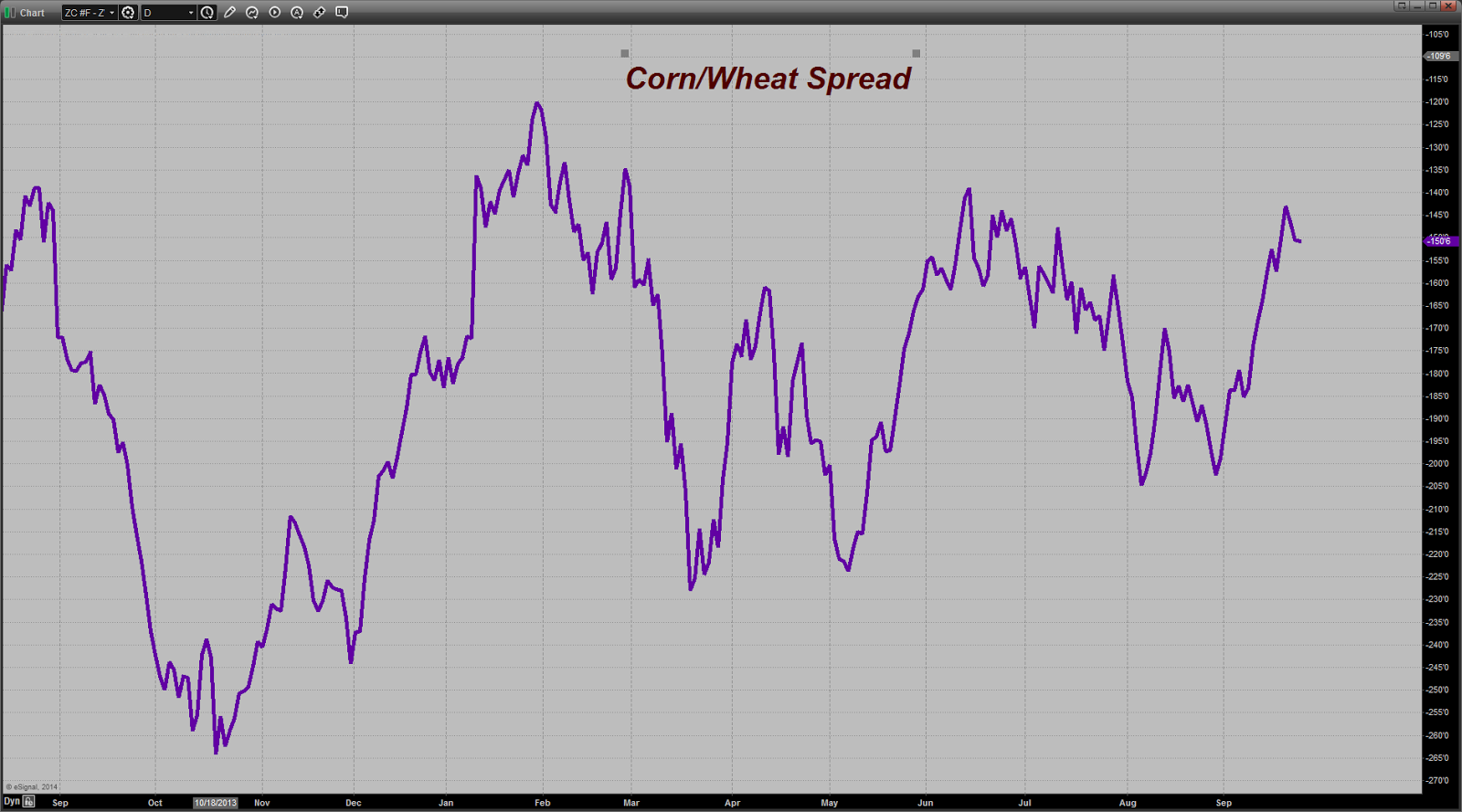 Shifting to the grains for a bit - that Corn/Wheat Spread, the one that has been keeping the big specs on the long ( and wrong) side of the corn market, once again failed near the 140 level. That just seems a bridge too far at this point. Corn managed to eke out some gains today as the forecast maps showed a rather large rain event scheduled to hit the corn belt near midweek of next week. That immediately set the bulls yapping about damaged crops, disease, delays in the harvest and the beginning of the Apocalypse. I read where one bullish analyst swore that he saw a Black Horse Rider going through the corn fields of Illinois with a big scale in his hands crying: " a quart of wheat for a denarius, and three quarts of barley for a denarius, and do not harm the oil and the wine".